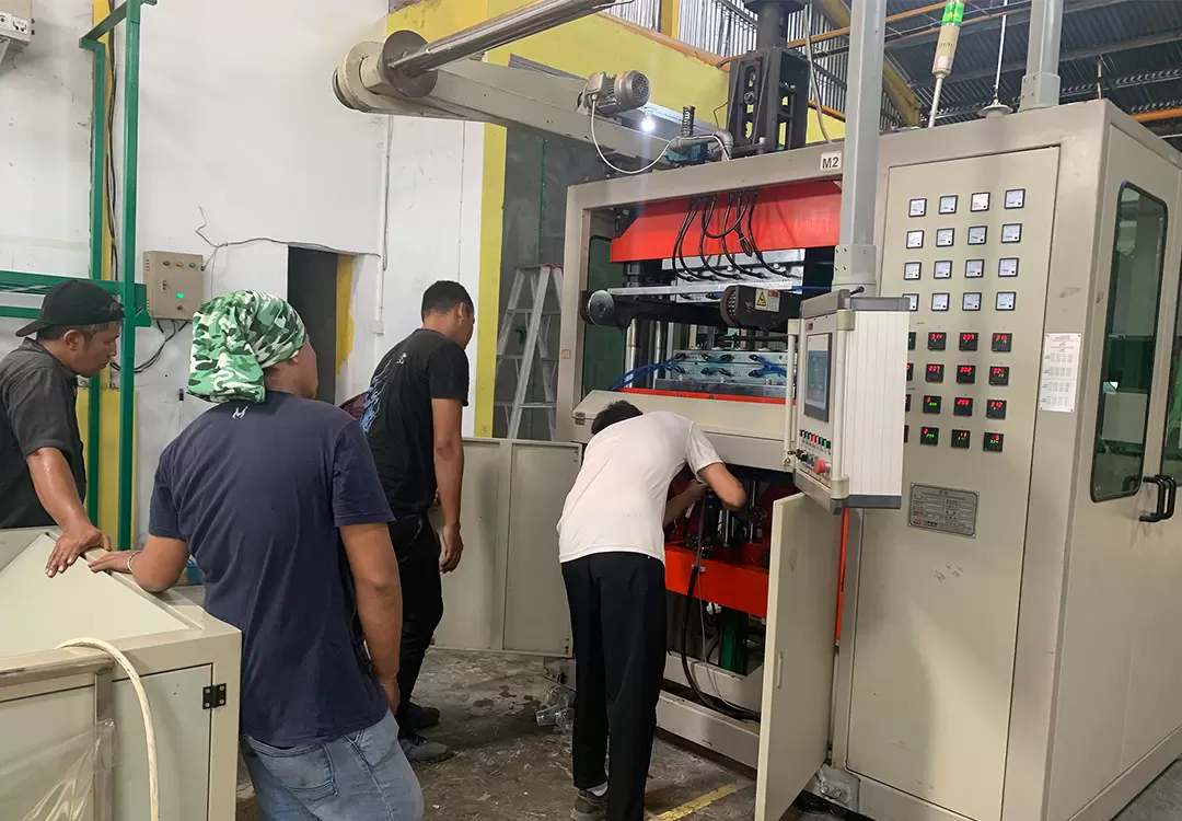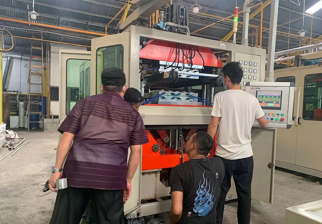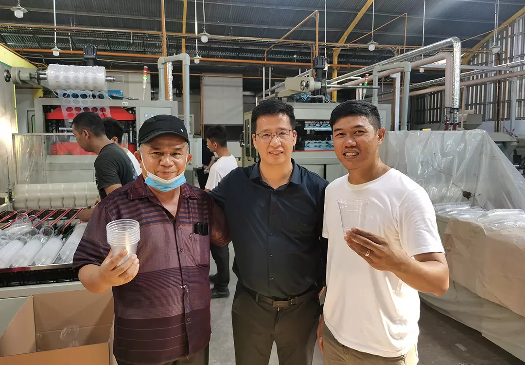 In early August 2023, our team went to Indonesia to visit old customers. This time our team went to the customer's factory and took the equipment commissioning engineer with us. The first purpose is to find agents for plastic thermoforming machines, and the second is to maintain old customers in Indonesia again. Adjust and maintain customers' equipment, and solve common faults and problems in daily production for customers. Customers warmly welcome our team to visit our factory. This customer purchased two TQC-650B plastic cup machines and two TJ-750D PP PS plastic sheet extruders from our company in 2021! our company in 2021!