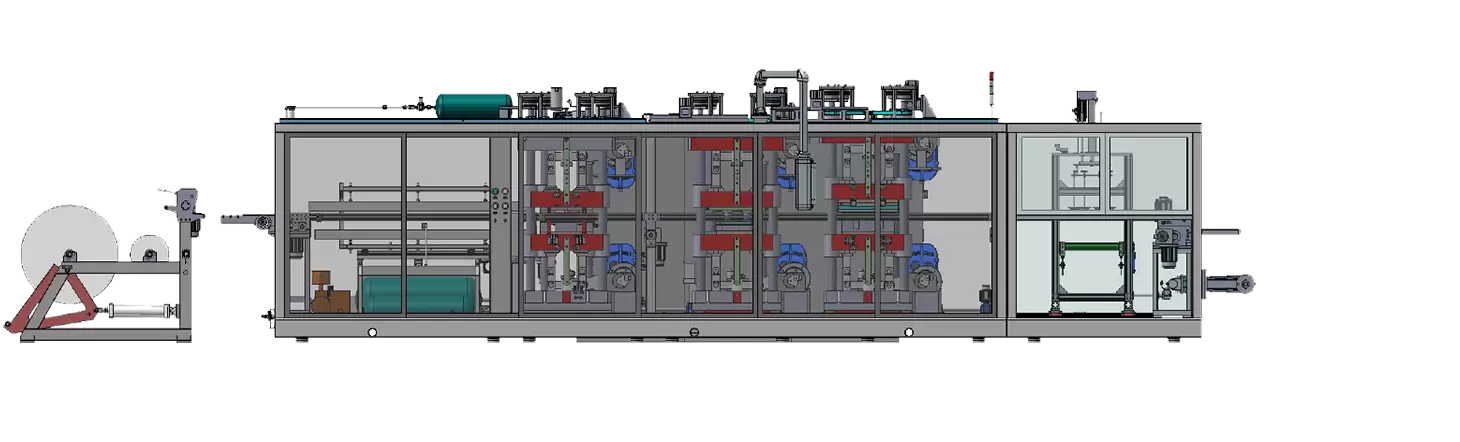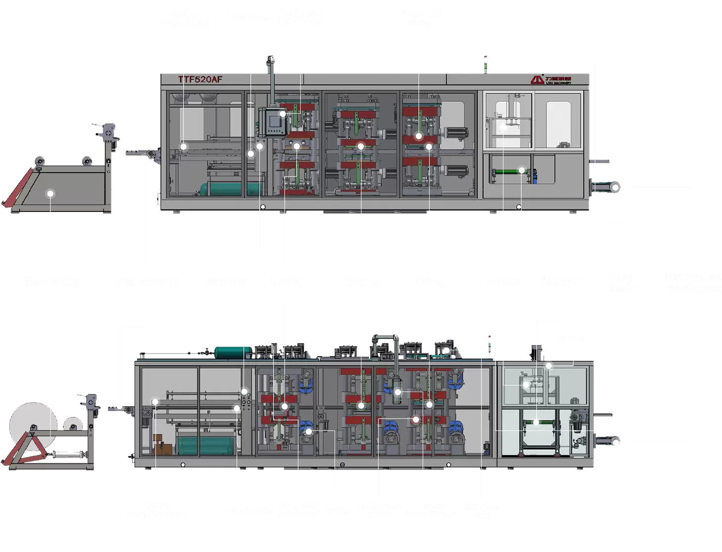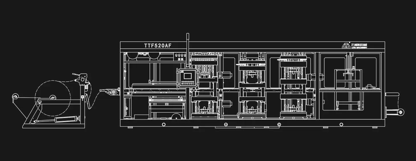 TTF series full-automatic thermoforming machine is our latest developed core product. The plastic thermoforming machine combines forming, punching, cutting, and stacking into process. For the production of disposable plastic products. Suitable for most of the customer requested, it can produce plastic trays, clamshell containers, lunch boxes, lateral hole fruit box, lids, ampoule tray, strawberry and blueberry box, etc plastic containers with holes. The machine is completely driven by servo motor. Stable operation, low noise, high efficiency, high quality.