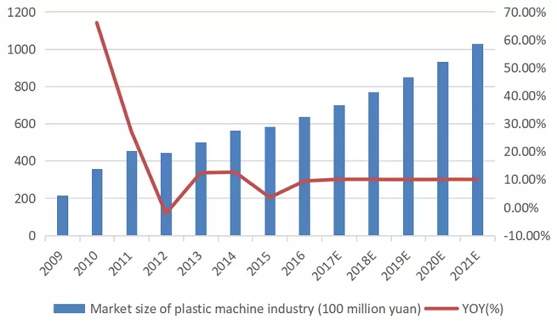 From the market analysis of plastic products, combined with the full play of my country's original production capacity of plastic machinery products, from 2001 to 2010, the average annual growth rate of domestic market capacity of plastic machinery products in my country is about 6%. In 2000 and 2005, it was 8 billion yuan and 11 billion yuan respectively, and it is expected to reach 14.5 billion yuan in 2010. With the improvement of my country's product quality and the increase of varieties, the share of plastic machinery products in the domestic market will also increase, which is expected to be 70%, 75% and 80% respectively; the total industrial output value of plastic machinery products is 5.6 billion yuan. , 8.25 billion yuan and 11.6 billion yuan. With the increase of my country's product exports, it is estimated that in 2010, the total industrial output value of my country's plastic machine products will reach 14 billion yuan, 2.33 times that of 2000, with an average annual growth rate of about 9%, of which the growth rate from 2001 to 2005 is 10% , the growth rate from 2006 to 2010 was 8%.